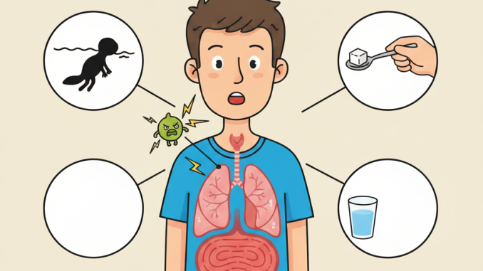 - Váš mozog okamžite zareaguje panikou a aby ochránil pľúca, bleskovo uzavrie hlasivkovú štrbinu (malú záklopku v hrdle).